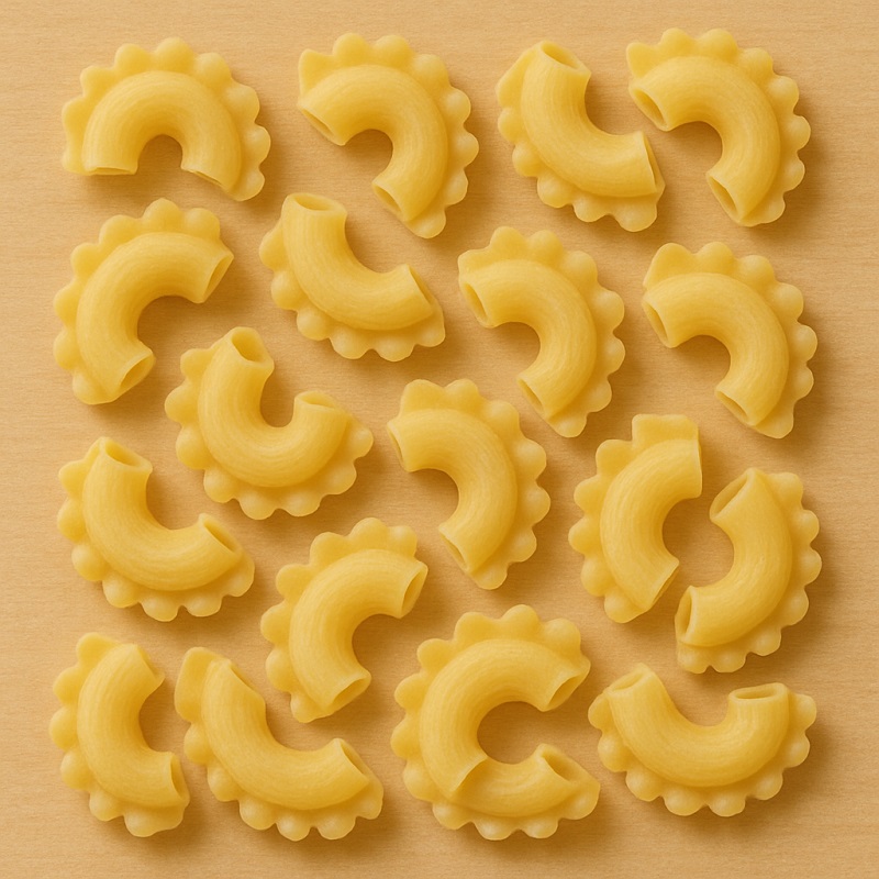 - Buet rørpasta, der ligner macaroni, men med en bølget kant på den ene side.