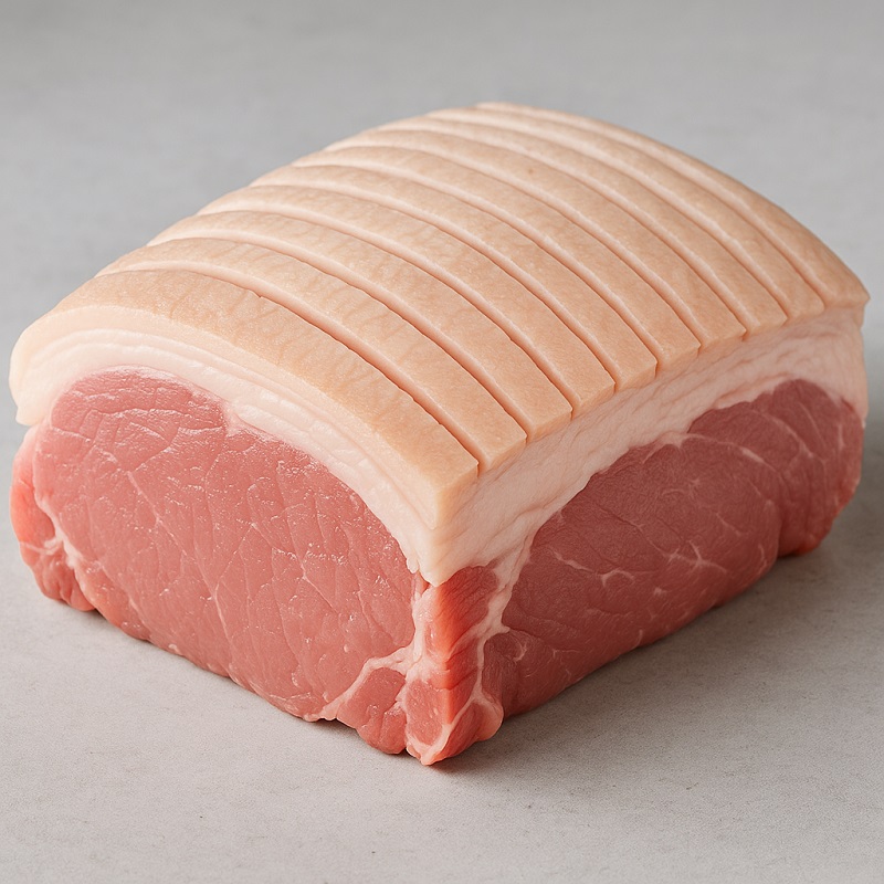 - Rå flæskesteg: lyserødt kød med hvidt fedtlag og svær.
