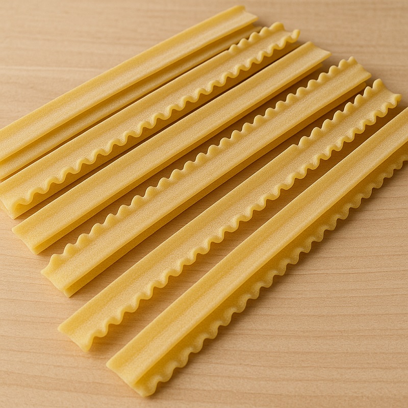 - Flad, bred pasta med én glat side og én bølget kant